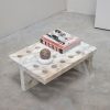 The soft curves of the Molecule stone pieces contrast with the heavy granite material, while the solid shape fits perfectly within the outline shape to give its own sense of balance when they are offset.